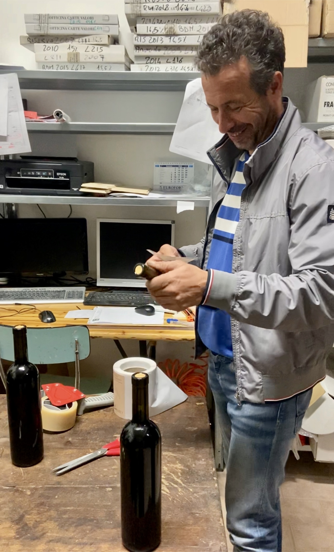 Eppure, i complimenti, e anche plateali, ha dovuto imparare a gestirli, perché dopo i punteggi ottenuti dalla critica specializzata in particolare per i suoi Brunello 2016, si è addirittura ritrovato a “Porta a Porta” da Bruno Vespa in cima alla classifica dei vini più buoni d’Italia! Lui non cambia però, non si dà le arie, resta quello che è, e continua ad abbassare gli occhi nel calice sorridendo ogni volta che gli faccio i complimenti, e glieli faccio spesso!