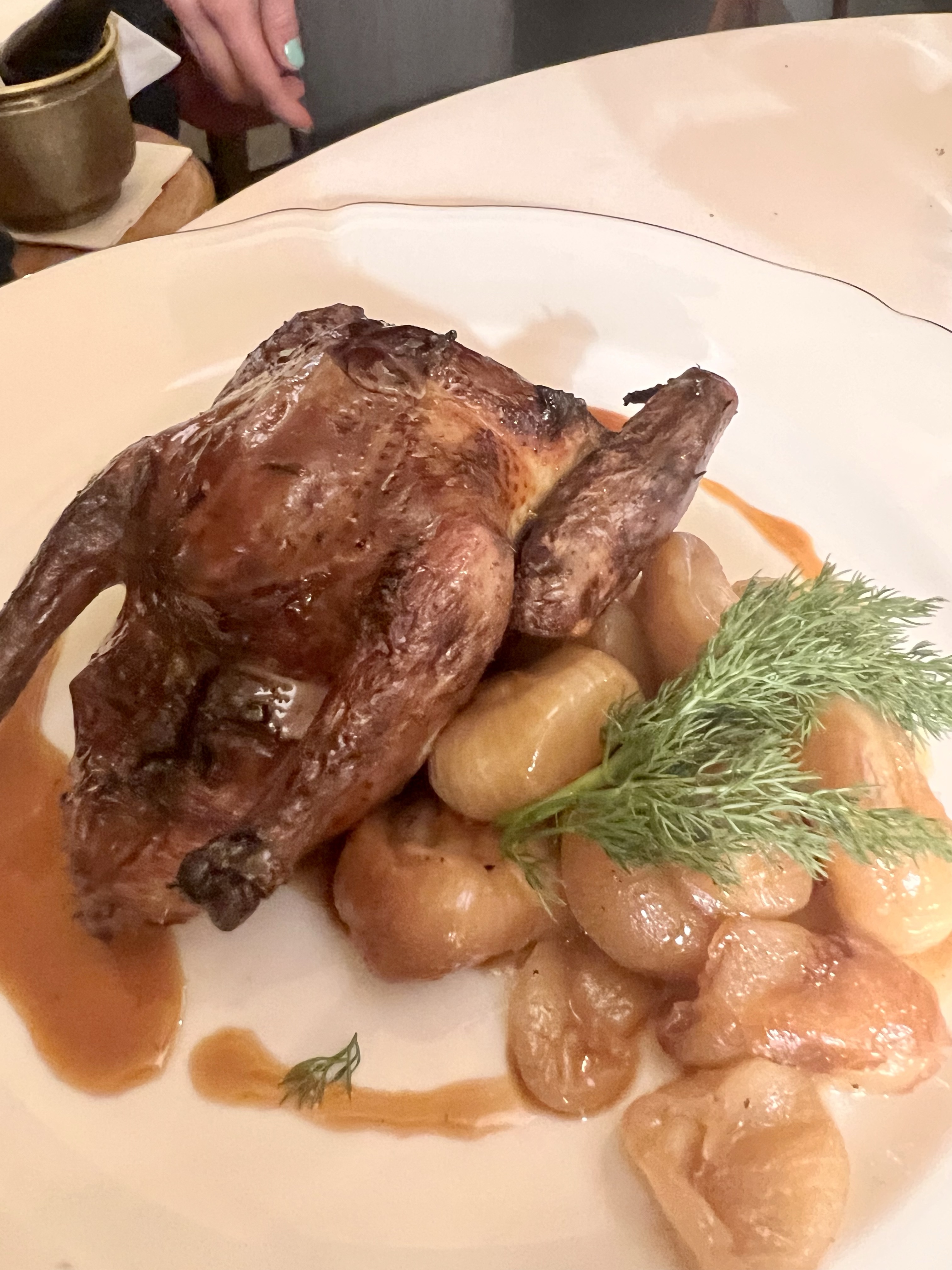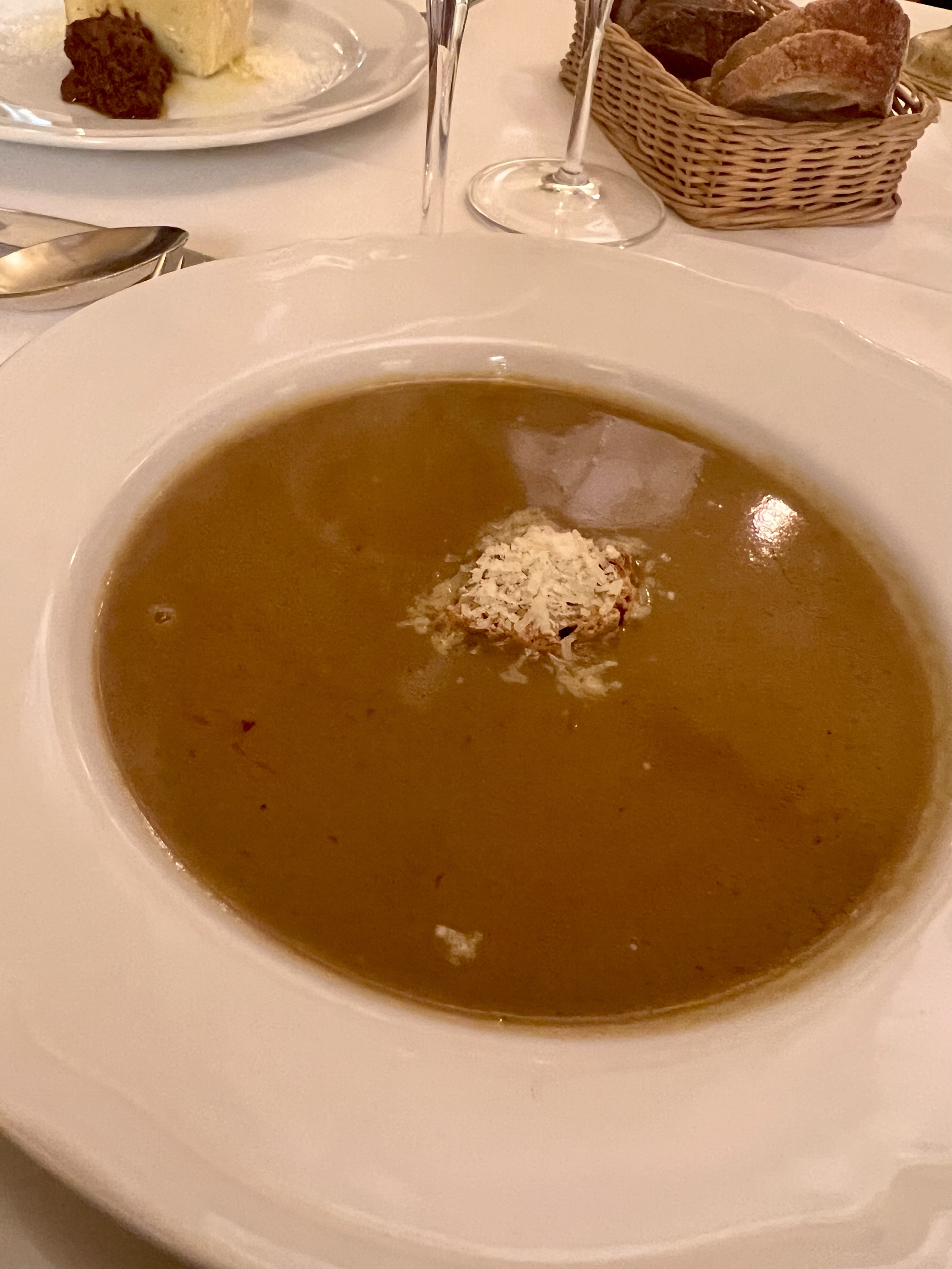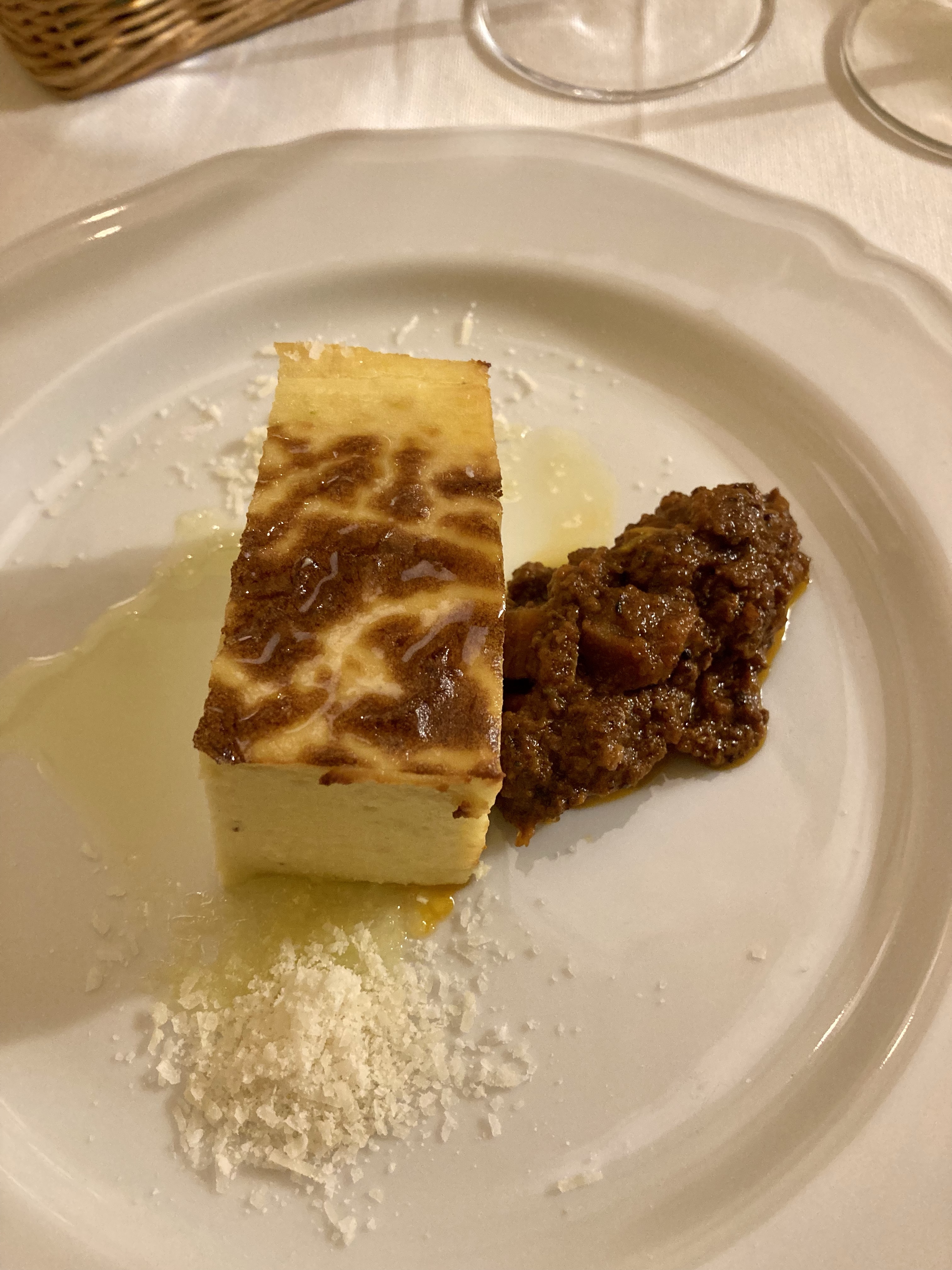 This versatile libation, with its invigorating freshness and graceful structure, proved an enchanting companion not only to the maritime delights but also to the potato and ricotta flan with ragout, and the delectably tender pigeon stuffed with mustard with sweet and sour Borettane onions – Dom’s chosen delights. While harmonizing seamlessly with each dish, the Tramonti Bianco reached its zenith when sipped alongside the amberjack stew, creating a ‘dolby surround’ effect that elevated every morsel, even the bread with which I elegantly indulged in polishing my plate.