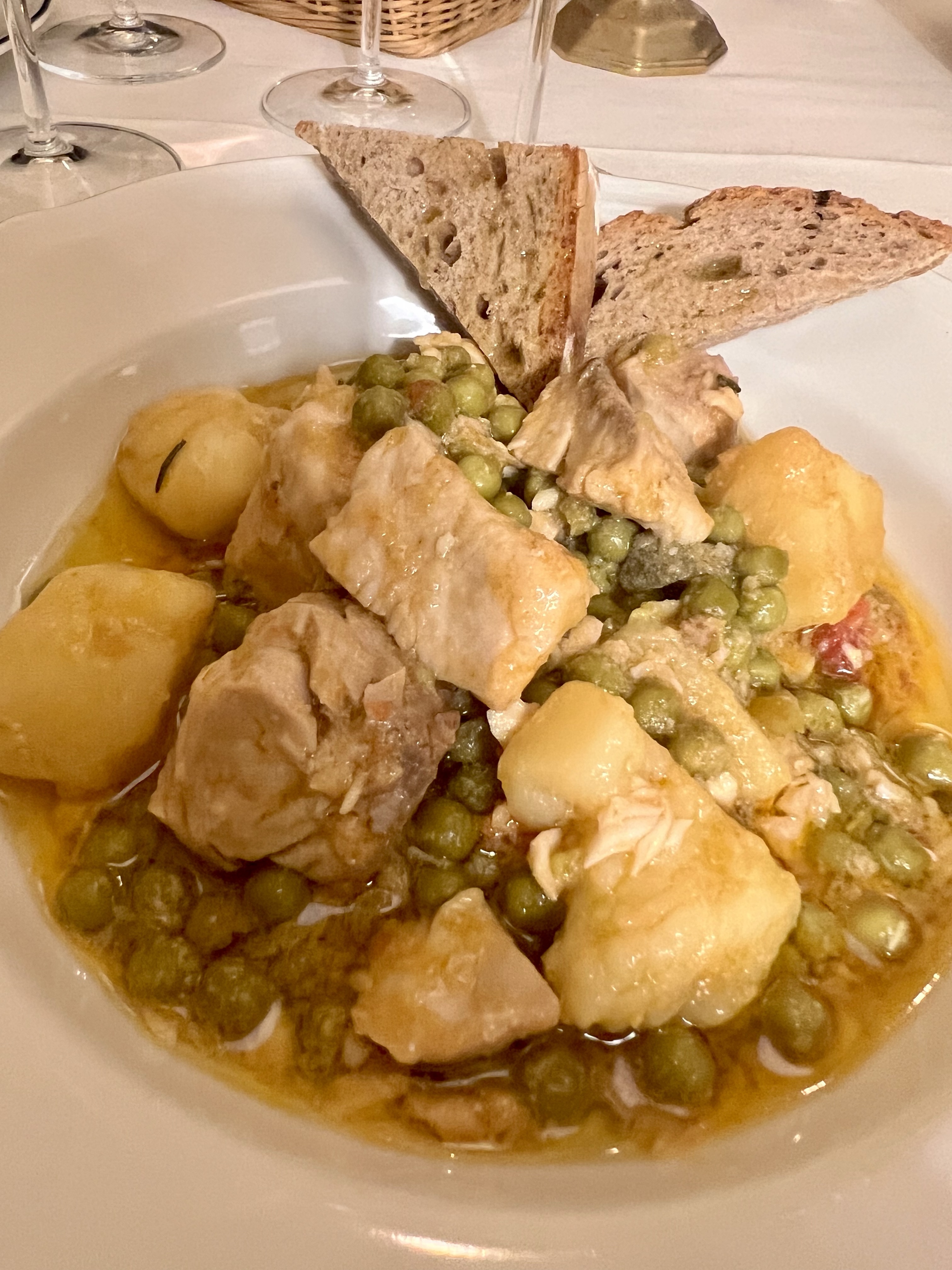 A stew adorned with peas and potatoes, evoking the warmth of home, family, and soothing comfort, is elevated by delectable bites of tender amberjack, a deep-sea fish with a delicately succulent flesh that I hold dear. Rather than attempting to dissect the organoleptic spectrum, the dish’s balance, or the richness of its flavors, I prefer to refrain. Much like those extraordinary wines that defy adequate description, this experience is best savored with closed eyes, allowing the moment’s profound pleasure to be etched into memory.